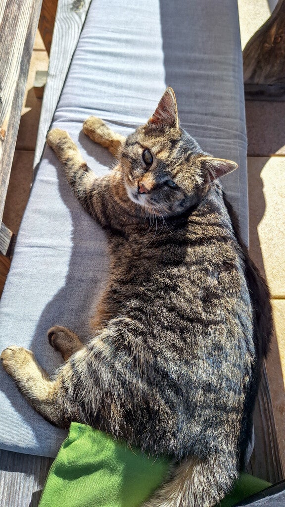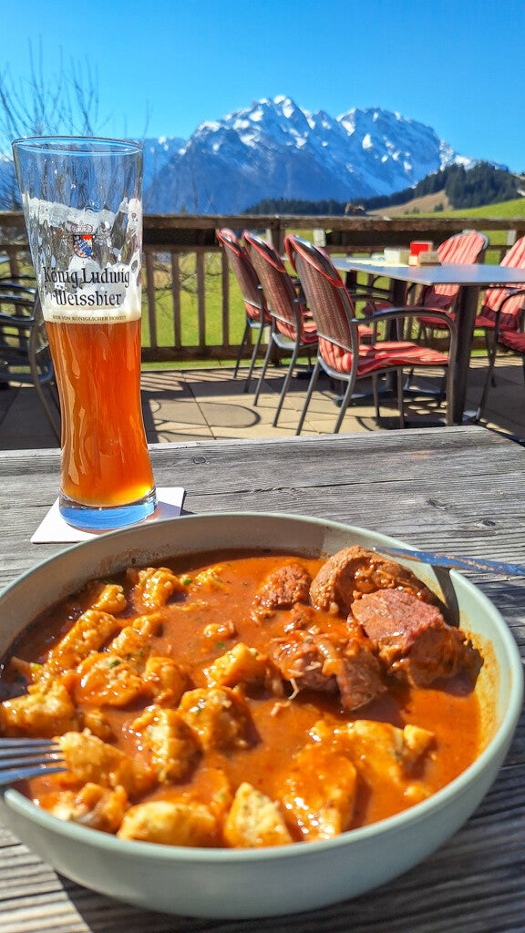 Irgendwie kam dann aber doch der Hunger auf, also ging's über sonniges Almgebiet und mit viel Panoarma wieder ein Stück runter bis zum Wanderparkplatz, wo ja das Auto stand. Dort habe ich den Rucksack verstaut und bin dann nochmals (ein kurzes Stück) rauf zum Gasthof Bachrain zur lässigen Sonnenterrasse. Ich wurde sogar von der Hauskatze 🐈⬛ persönlich begrüßt und zu Streicheleinheiten aufgefordert. Die Wirtin meinte allerdings, dass das "Betteln" wahrscheinlich am Rindsgulasch 😋 lag.