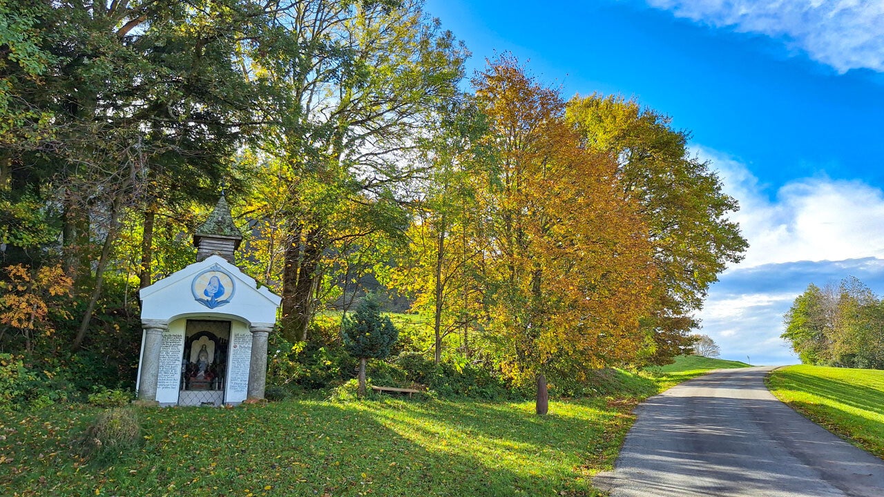 In diesem Dorf gibt's nur kostenlose Parkplätze - ich habe mitten im Ort vor dem Gemeindeamt geparkt. Dann führte mich mein Weg mal über Waldwege, dann über Feldwege, aber auch über Forst- und Asphaltstrassen bis zum Ortsteil 'Hochkuchl'. Von da muss man dann nur mehr der hügeligen Strasse und den Holzschildern bis zum 'Hochkuchlbergkreuz' folgen. Diese Runde bietet lässige Ausblicke, momentan viele Herbstfarben und an jeder Ecke irgendwelche Pilze. Ich habe noch nie sooooo viele Fliegenpilze auf einer Tour gesehen - lässige Motive für Fotografen sind damit garantiert.