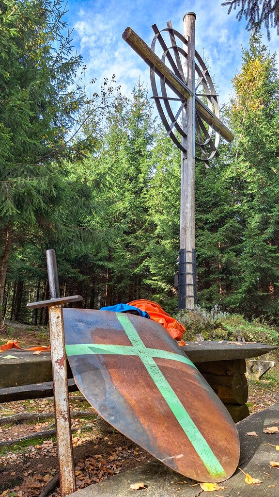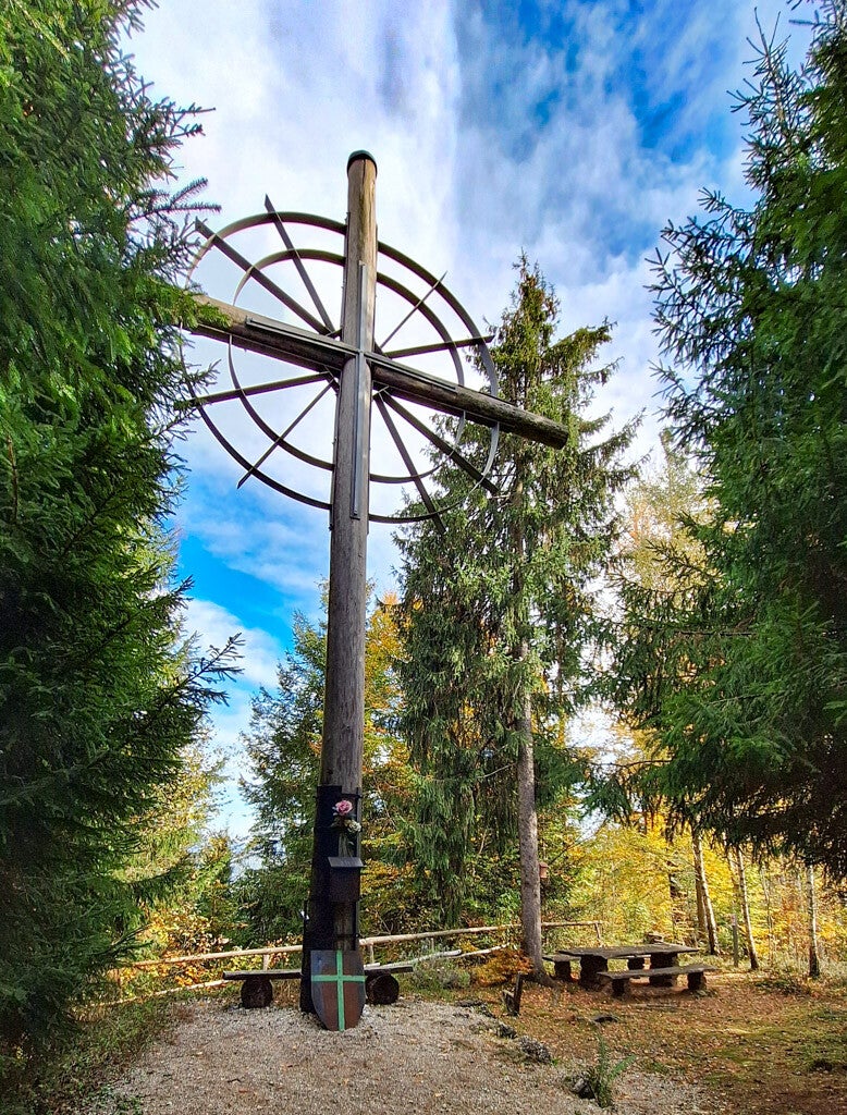 Das Gipfelkreuz steht mitten im Wald, hat etwa 10 m Höhe, nebenan sind einige Sitzmöglichkeiten, beim Kreuz gibt's auch ein Schwert mit passendem Schild und natürlich ... jede Menge Fliegenpilze rundherum. Das einzige was fehlt ist die Aussicht.