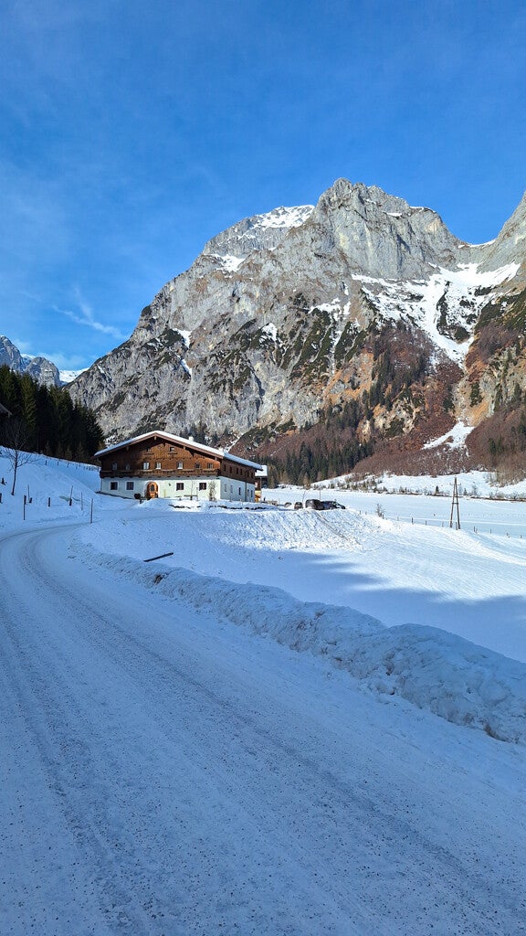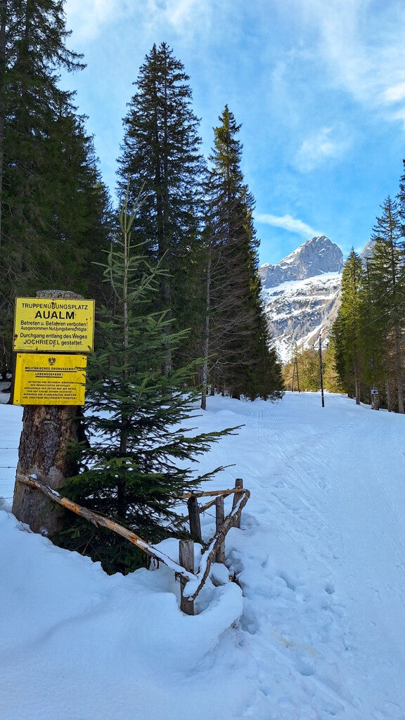 Vom kostenlosen Parkplatz beim Lammertal-Lift geht man dann etwa 1,5 km auf einer wenig befahrenen - und derzeit total vereisten - Strasse bis zu einem Bauernhof. Es gibt dort auch ein paar Parkplätze, die sind aber eigentlich für die Ski-Touren-Geher gedacht. Ab dann ging's für mich - im Schatten - über eine etwa 2,0 km lange vereiste/schneebedeckte Forststrasse bis zum ehemaligen Militär-Truppenübungsplatz. Ab diesem Zeitpunkt ist dann Sonne mit MEGA-Panorama angesagt. Das Highlight ist aber sicherlich die sonnige und windgeschützte Aualm im Talschluss. Natürlich gibt's dann von dort noch viele weitere echt lässige Bergtouren, wie zB zur Bischlinghöhe, zum Frommerkogel oder rund um den Hofschoberberg.