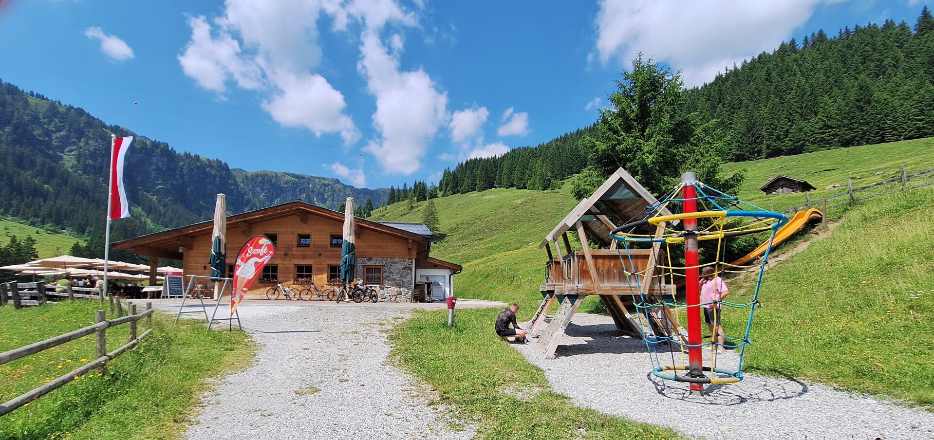 Mein finales Ziel war der Talschluß-Höhenweg mit Einkehr bei der Saalalm und der Ossmannalm. Dieser stetig flach steigende Höhenweg führt über verschiedene Untergründe (Forststraße, Waldweg, Almweg, ...) und immer in der Sonne zu den bewirtschaften Hütten 🍲🍺😋. Von diesen Hütten gibt's dann viele weitere sportlichen Wandermöglichkeiten. Wenn man aber auf dem Höhenweg bleibt, kommt man wieder zur Touristen-Hochburg bei der Lindlingalm. Für den Rückweg zum Wanderparkplatz habe ich dann die andere Wegvariante gewählt - war auch nett.