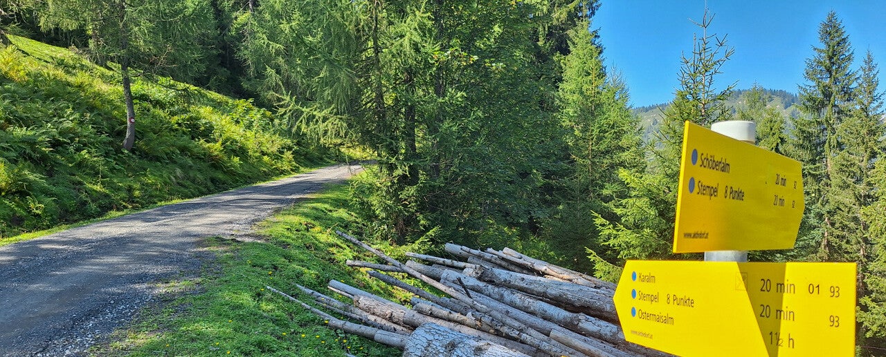 Start der Tour ist beim kostenlosen Parkplatz in der Nähe vom Skilift Lammertal (Gemeinde Lungötz). Nimm den linken Weg (Schöberlweg) Richtung St. Martin/Tgb. und folge einfach der stetig steigenden Forststrasse - irgendwann ist dann auch die 'Karalm' ausgeschildert. Die Karalm liegt am Endpunkt einer für Autos gesperrten Forststrasse in einer kleinen Senke unterhalb der Koreinhöhe auf etwa 1460 m Seehöhe.