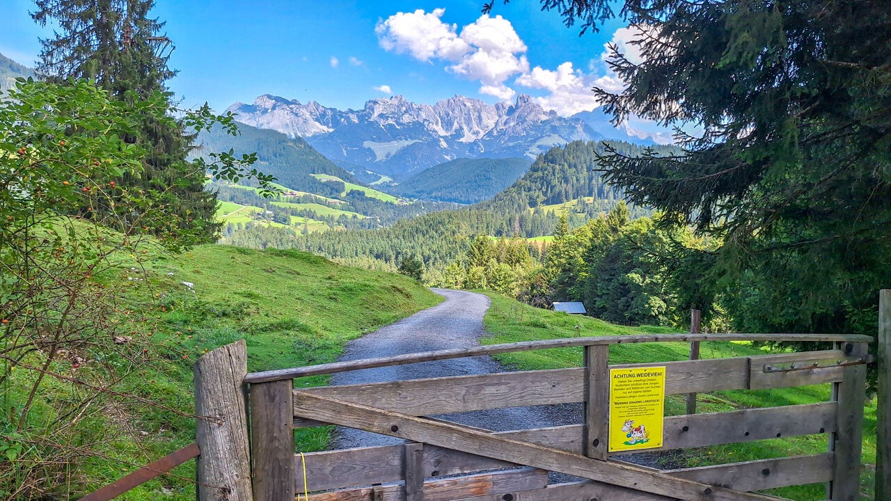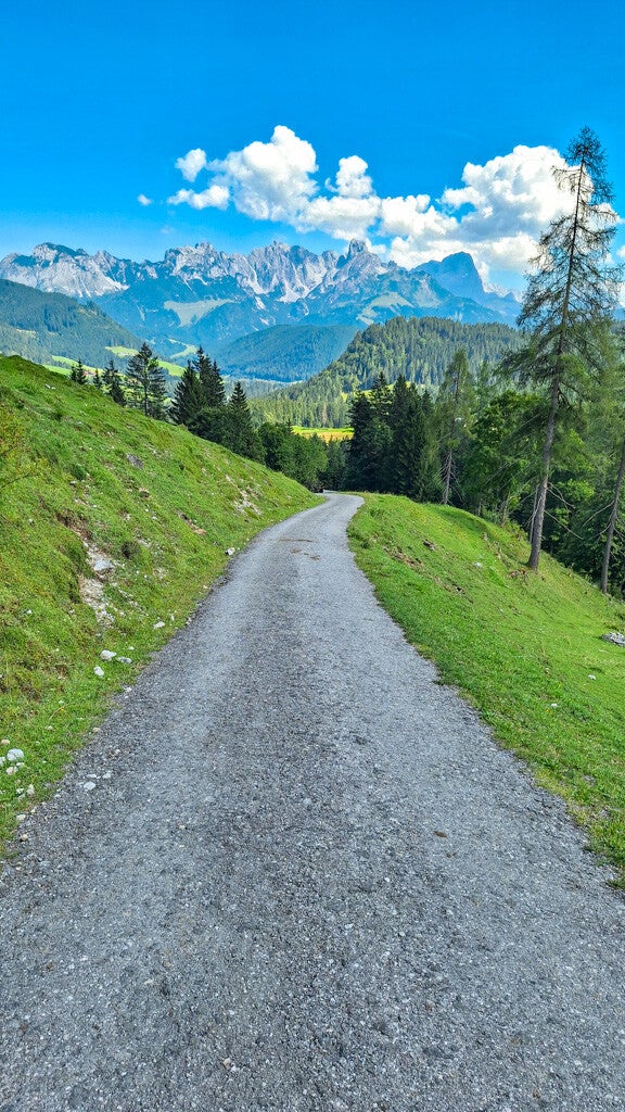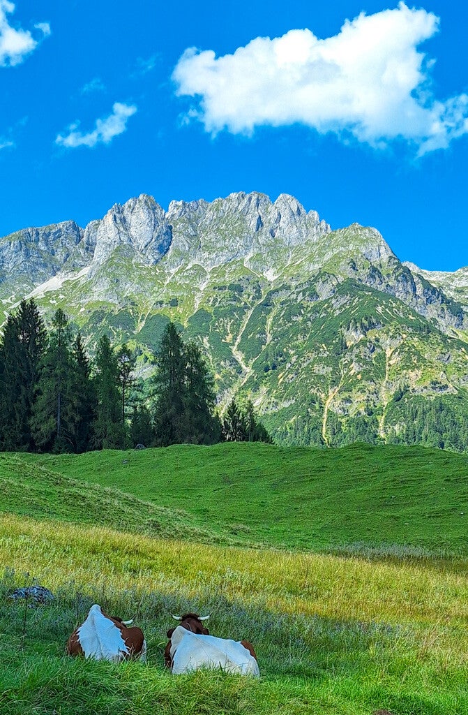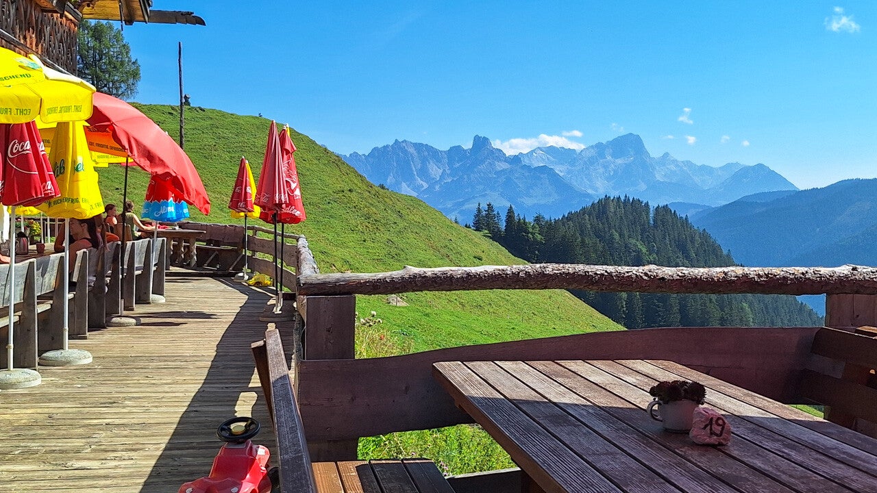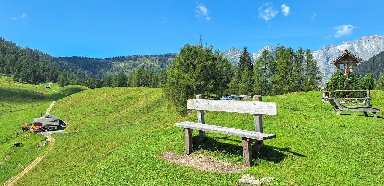 Der Weg dahin hat einiges zu bieten: MEGA-Ausblicke auf das sehr nahe Tennengebirge. Coole Ausblicke auf den Dachstein und auch auf die Bischofsmütze. Aber auch Almen müssen überquert werden. Eierschwammerl wollen direkt neben dem Wanderweg geerntet werden. Und auch einen Gipfelbereich mit Marterl, Sonnenliege und Sitzbankerl gibt's am Weg zur Karalm.