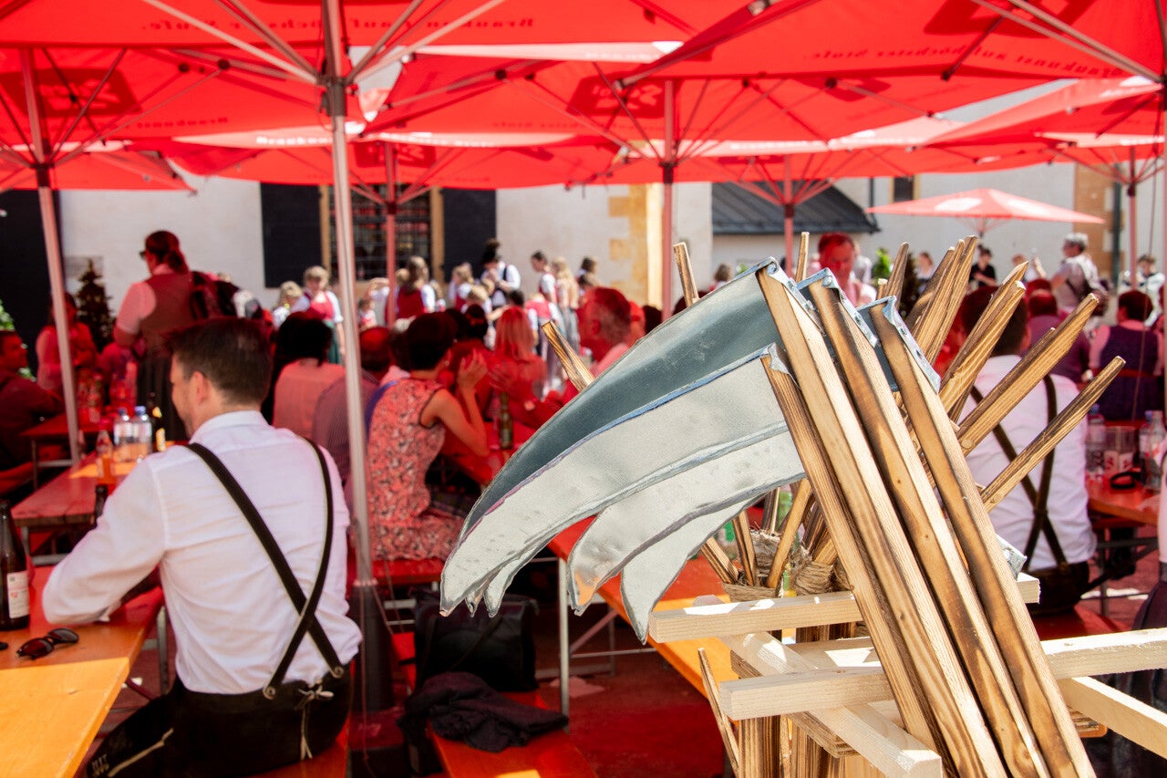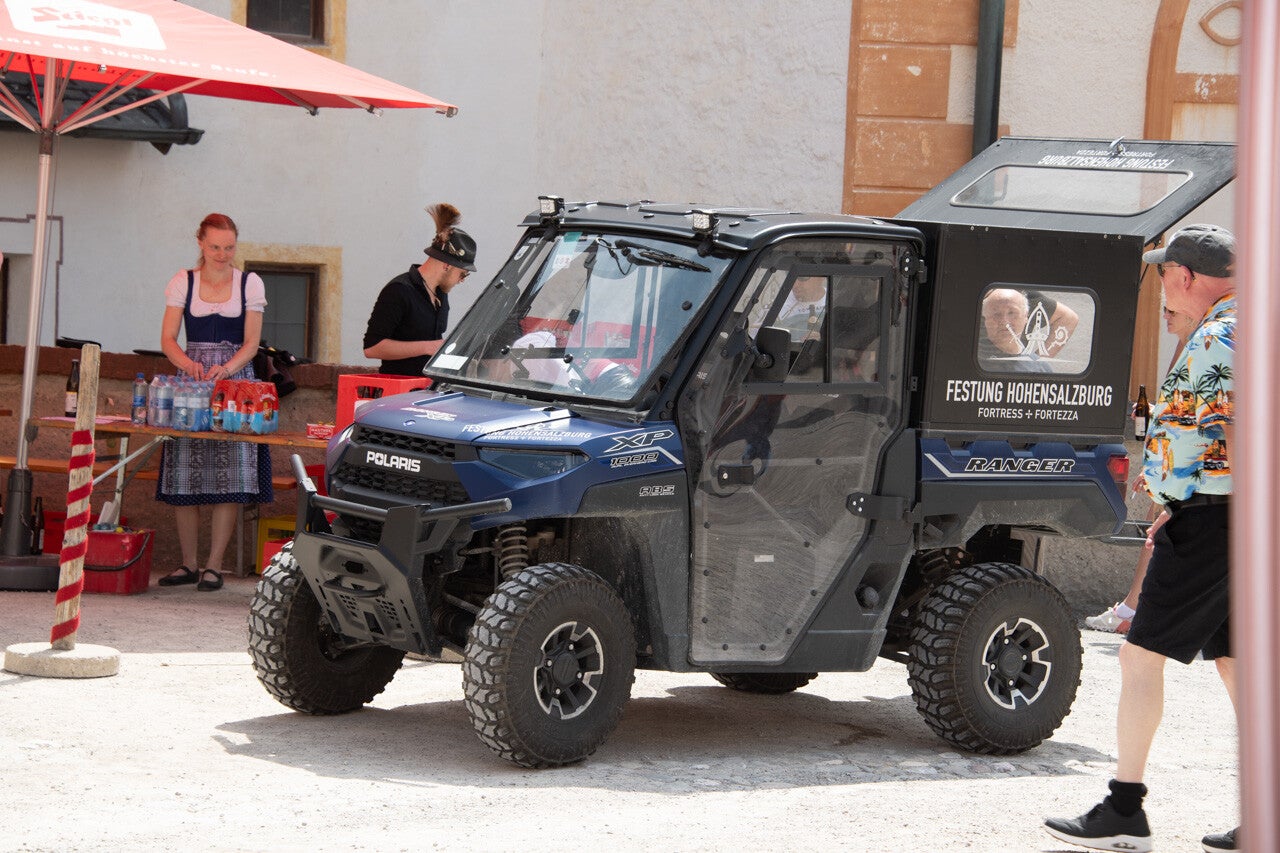 Bei strahlendem Sonnenschein fand am Samstag, den 8. Juni 2024 der Volkstanztag auf der Festung Hohensalzburg statt. Es fing allerdings schon ziemlich mühsam für mich an, zumal unser 'Ticketmann' für die Festungsbahn noch nicht da war. Also musste ich zu Fuß mit vollem Fotorucksack raufgehen. Oben angekommen ging's dann gleich anstrengend weiter, zumal ja erst noch alles (Tischgarnituren, Sonnenständer für die Sonnenschirme, ...) aufgebaut werden musste. Und auch die Getränke mussten vom Lager erst mal zum Burghof gebracht werden. So gegen 11:00 Uhr kamen dann auch die diversen Helfer noch dazu - da waren wir aber schon fast (körperlich) fertig !!!